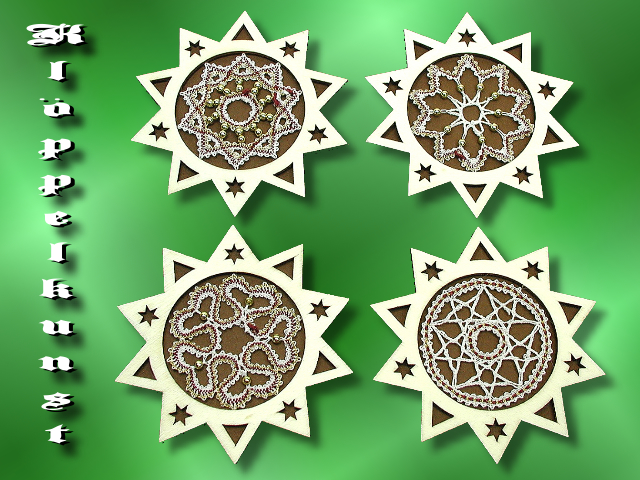 Die Abbildung zeigt eine fertige Klöppelarbeit im passenden Holzrahmen und ist nicht Bestandteil des Lieferumfanges, dieser besteht nur aus dem Klöppelbrief (Anleitung) der je nach Motiv aus einer oder mehreren Seiten bestehen kann.