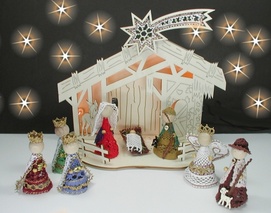 Die Abbildung zeigt eine fertige Klöppelarbeit mit Krippe und ist nicht Bestandteil des Lieferumfanges, dieser besteht nur aus dem Klöppelbrief (Anleitung) der je nach Motiv aus einer oder mehreren Seiten bestehen kann.